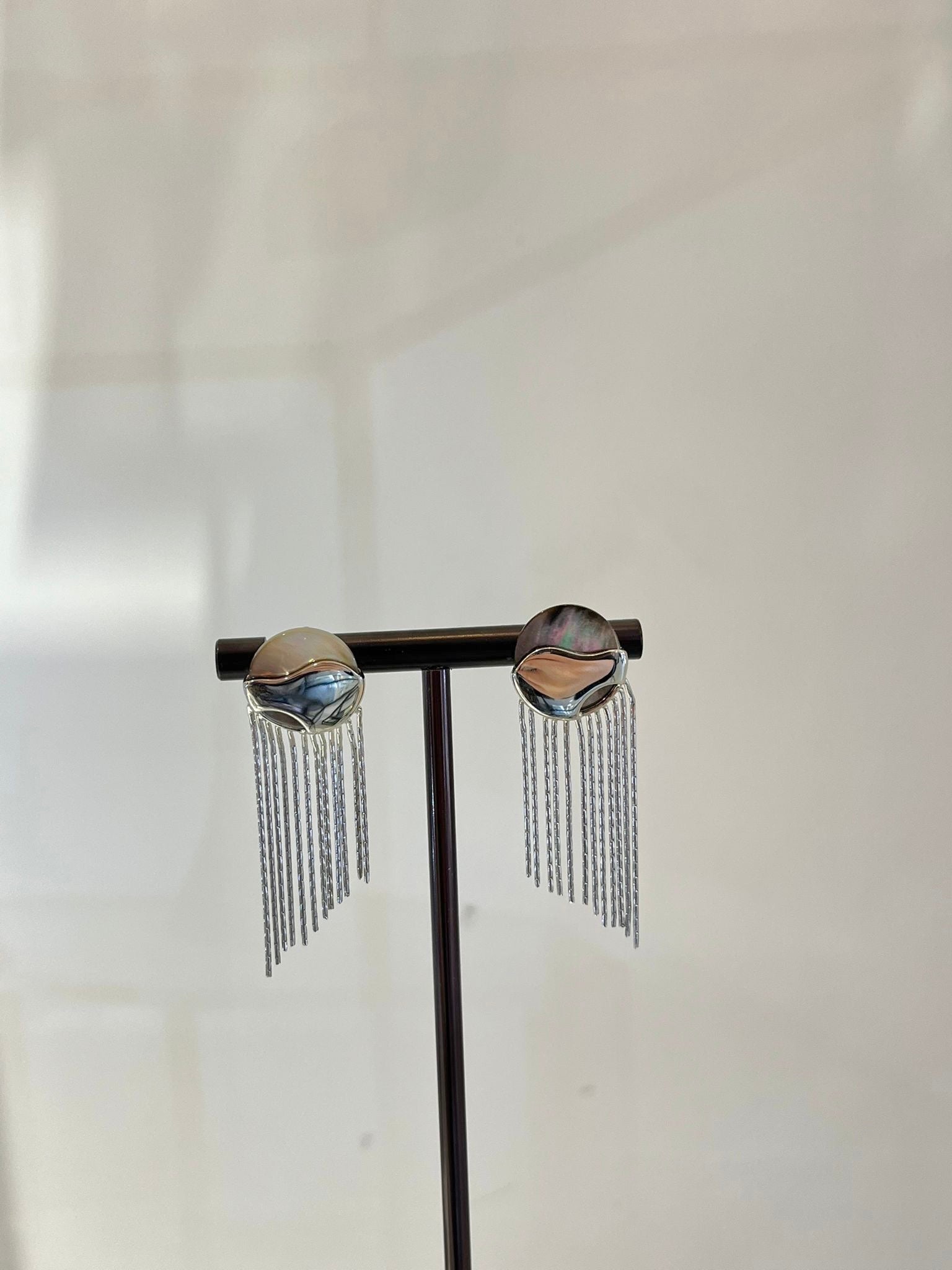 Love Whisper Earrings — a soft shimmer with a bold sway. Crafted in 925 sterling silver and luminous Mother of Pearl , each stud features an organic wave detail that hugs the iridescent shell, then falls into silky silver tassels that move with every step. Elegant, modern, and quietly romantic—like a love note you wear.